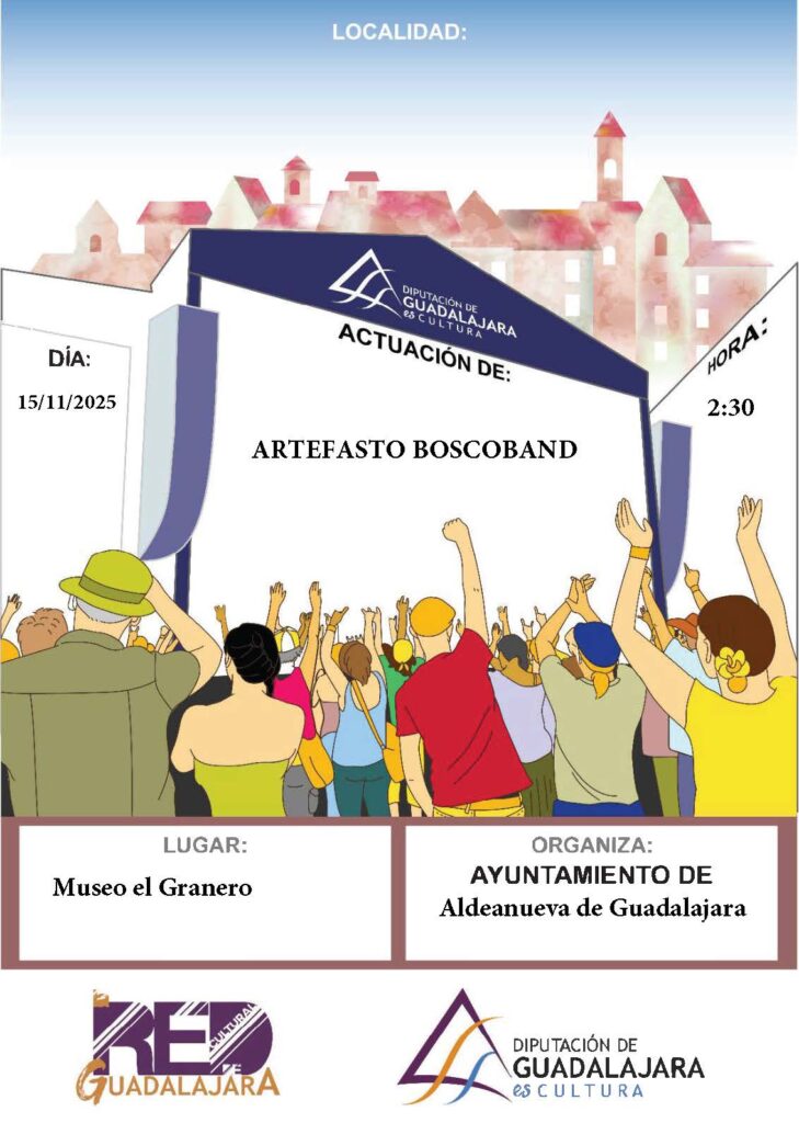 La actuación de Artefasto Boscoband, celebrada el 15 de noviembre de 2025 en el Museo El Granero, en Aldeanueva de Guadalajara, fue un rotundo éxito. El espectáculo, con una duración aproximada de 2 horas y 30 minutos, logró llenar el espacio y conectar de forma extraordinaria con el público, que disfrutó de una propuesta artística dinámica, cercana y de gran calidad. 20251105_Otros_Cartel